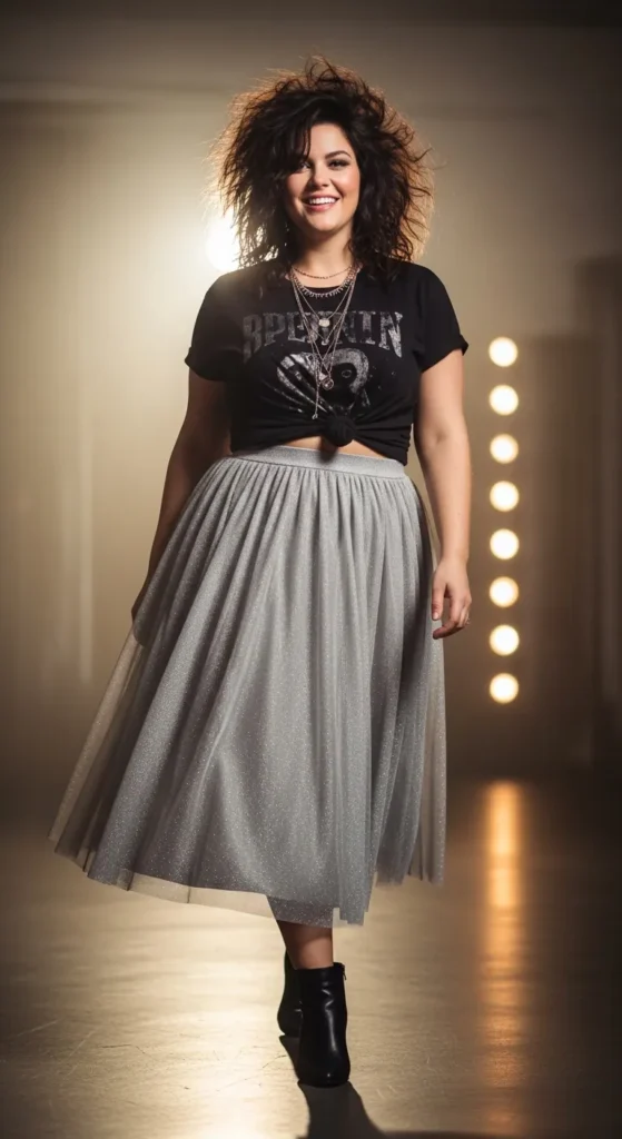 For a playful take on party wear, mix a sparkly tulle skirt with a tucked-in graphic tee — it’s equal parts edgy and fairy-tale.