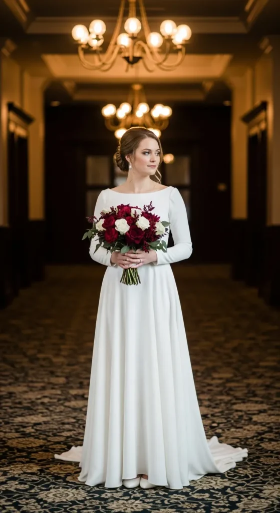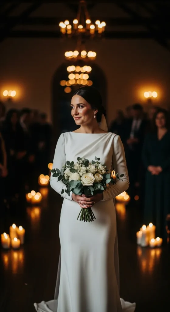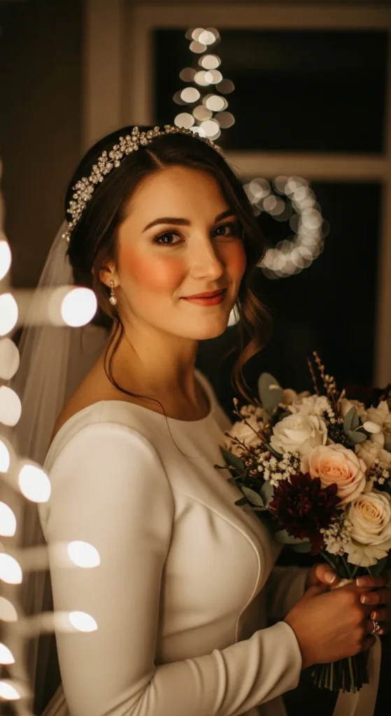 This gown feels intimate and warm, ideal for cozy winter venues where every moment feels meaningful.
