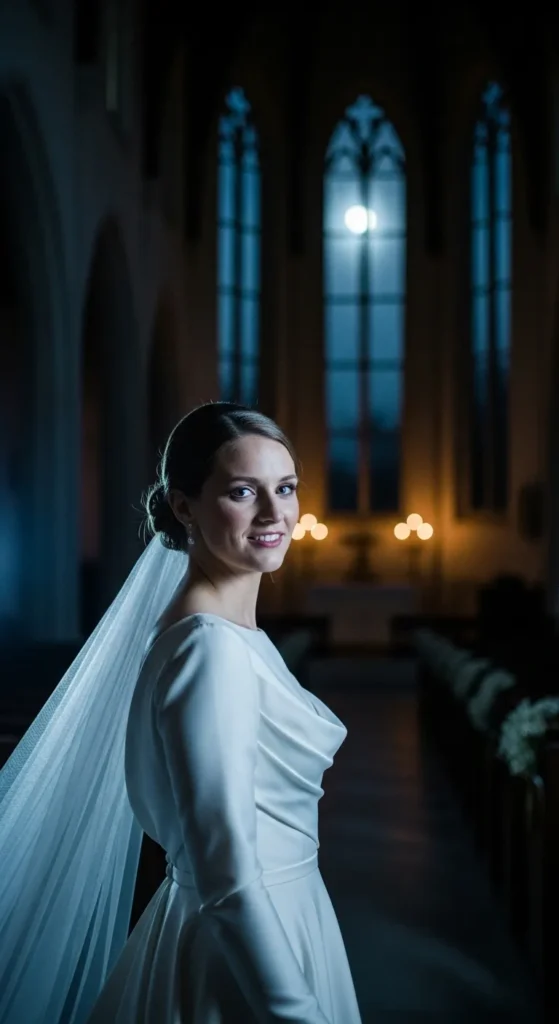 Designed for quiet winter evenings, this gown carries a serene presence. It feels calm and graceful, allowing the bride’s emotion to take center stage rather than heavy detailing.