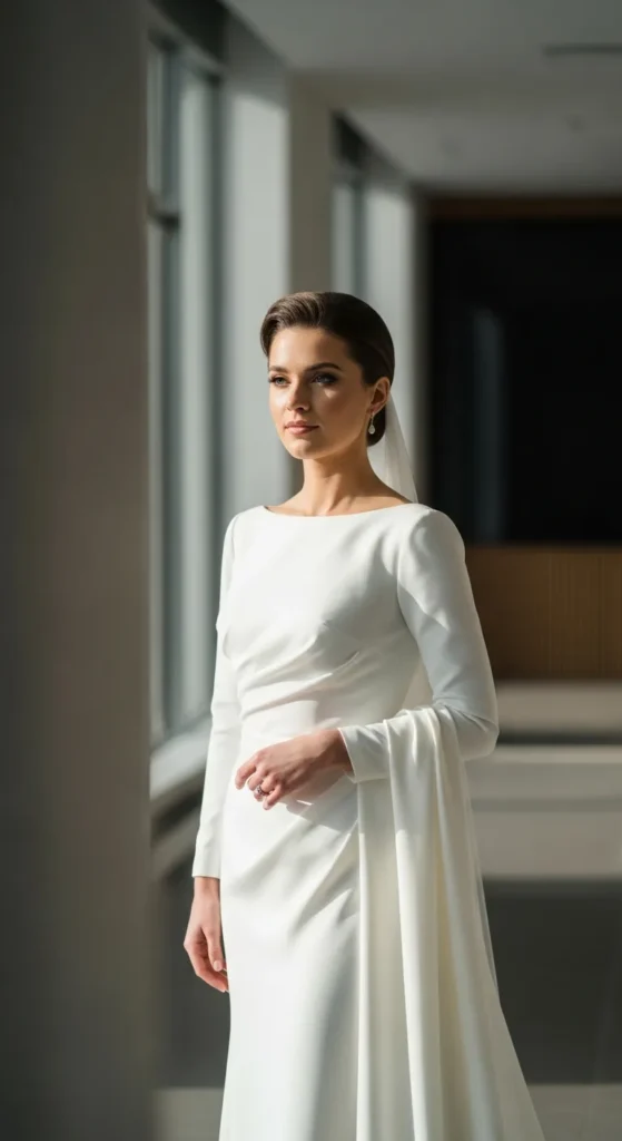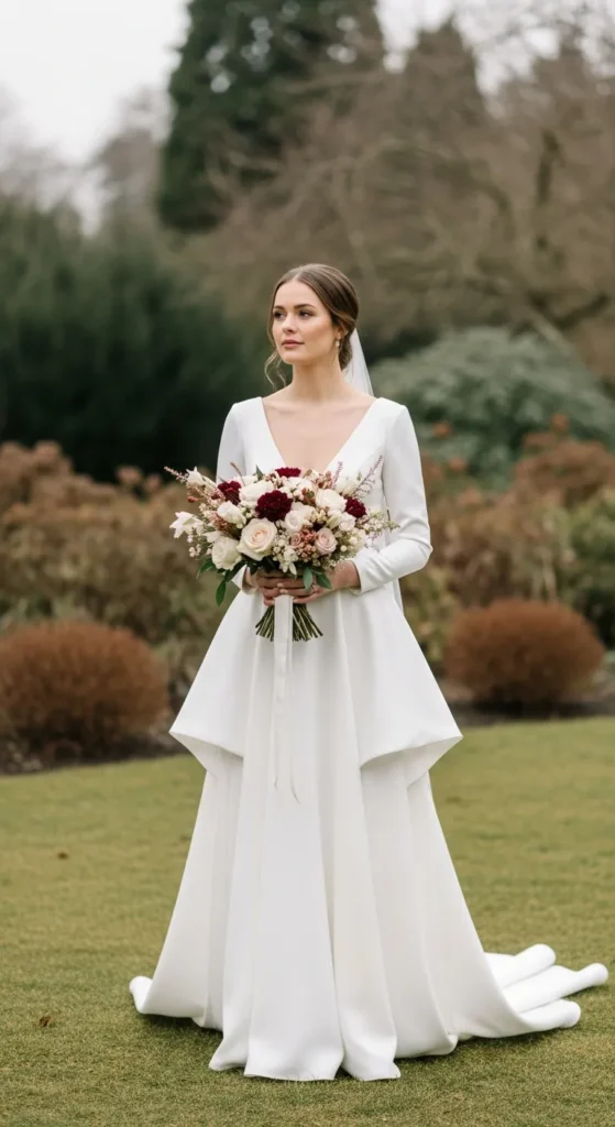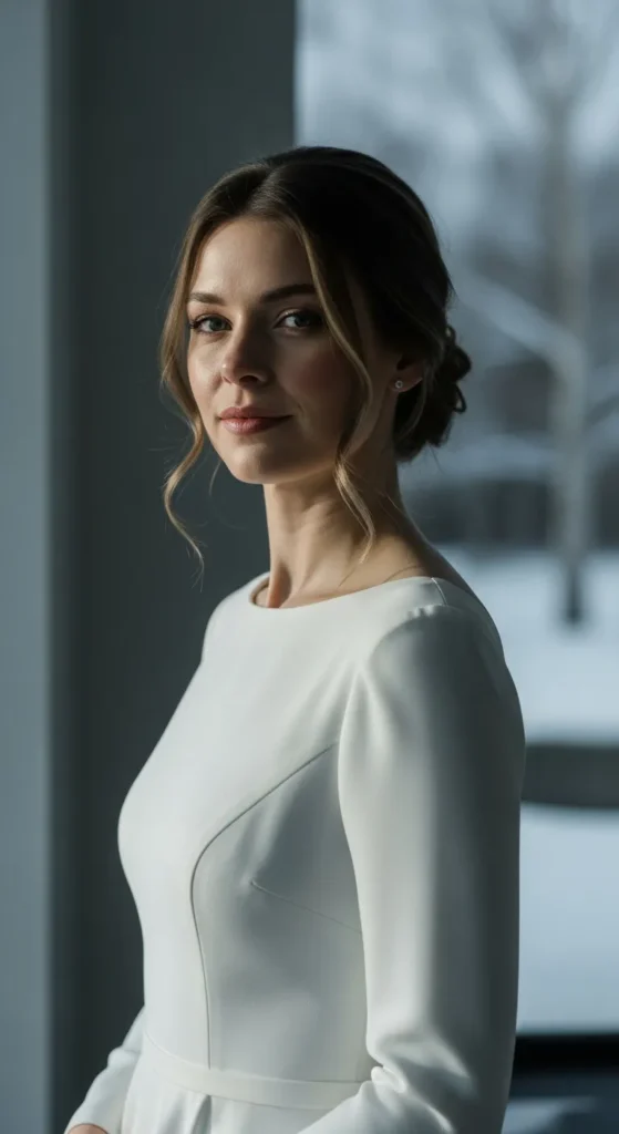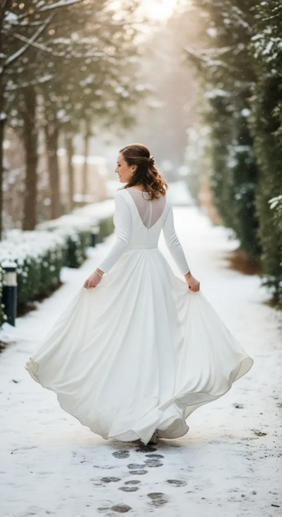 This gown embraces movement and comfort, softly shaping the body while feeling wearable. It’s perfect for brides who want elegance without stiffness on a cold winter day.