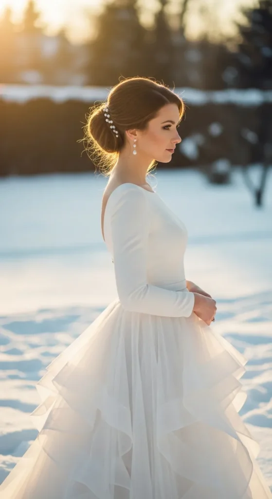 Designed to catch natural winter light, this gown feels airy and hopeful. Perfect for daytime ceremonies with a gentle, romantic mood.