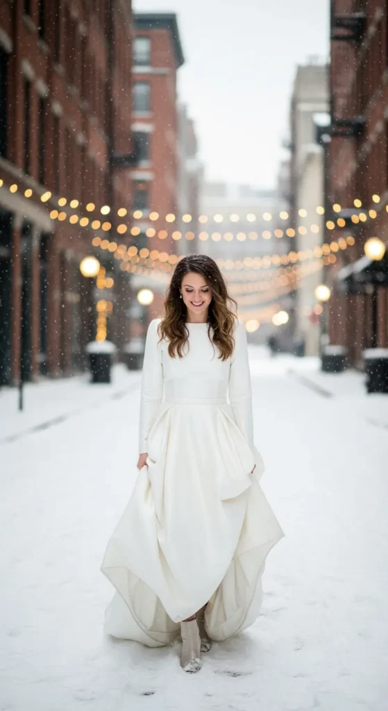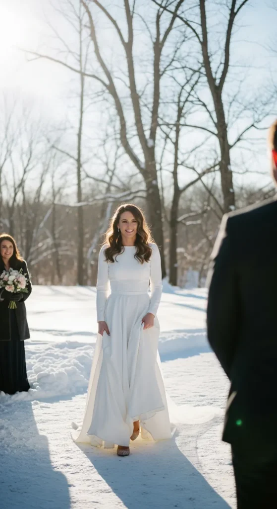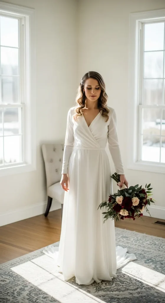 This dress balances warmth and elegance, wrapping the bride in comfort while still feeling refined. It’s ideal for winter ceremonies that feel cozy, emotional, and deeply personal.