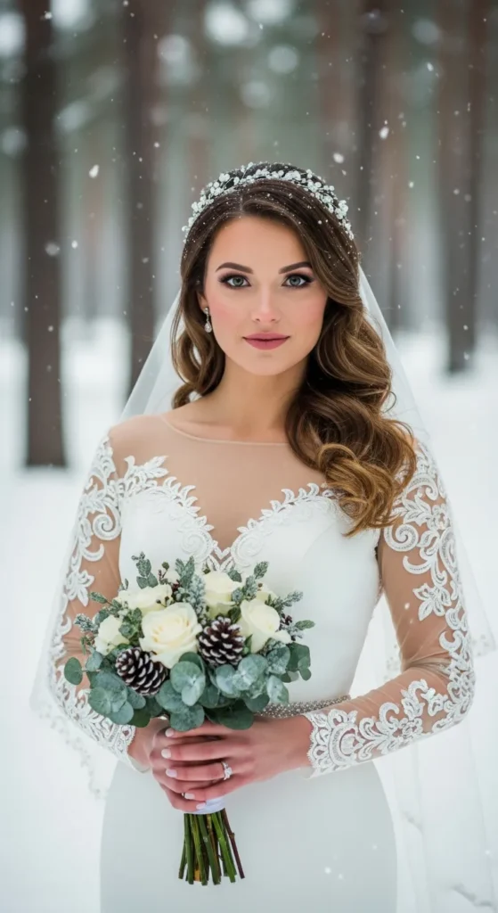 Stylist Suggestion– Add a crystal hair vine woven into loose waves. It mirrors frost-like sparkle while keeping the look youthful and softly romantic.