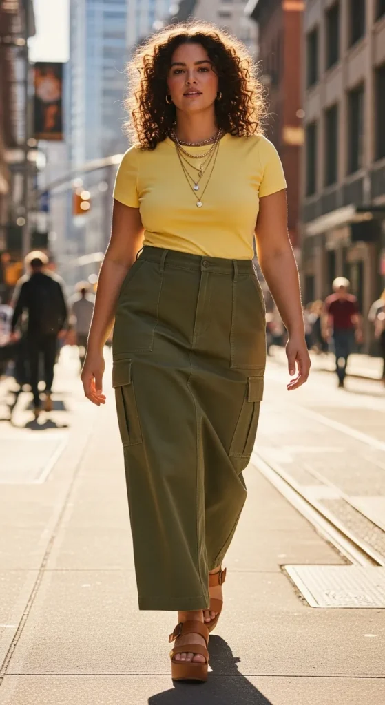 A fitted baby tee styled with a cargo-style maxi skirt blends softness with utility. The structured pockets add dimension while the fitted top keeps your silhouette defined.