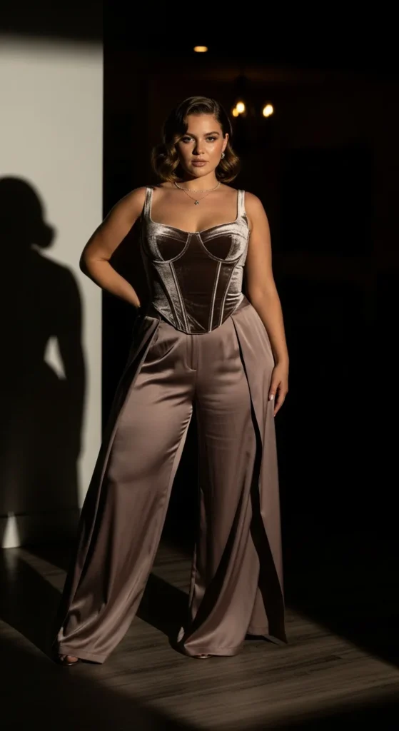 A corset-style top paired with wide-leg pants creates a structured waist with flowy movement below.
