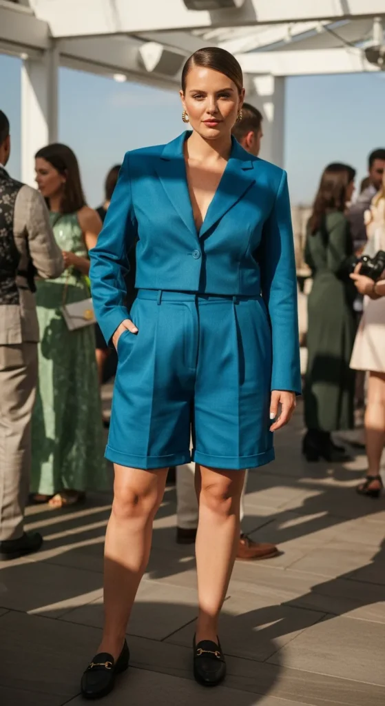 A cropped blazer paired with matching shorts creates a structured yet playful co-ord look that feels polished.