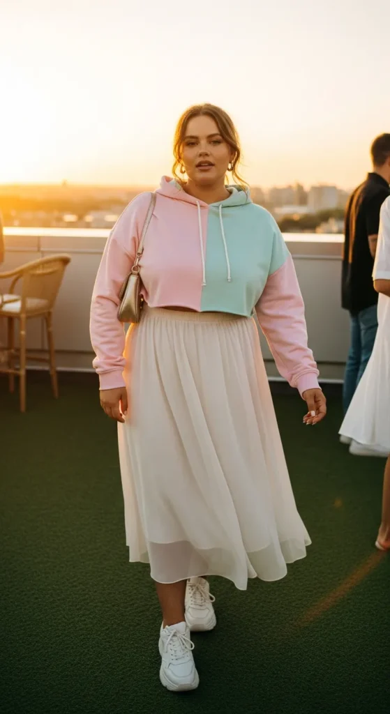 A cropped hoodie paired with a soft, flowy midi skirt creates a perfect balance between casual and feminine. The movement of the skirt adds ease, while the cropped top defines your waist beautifully.