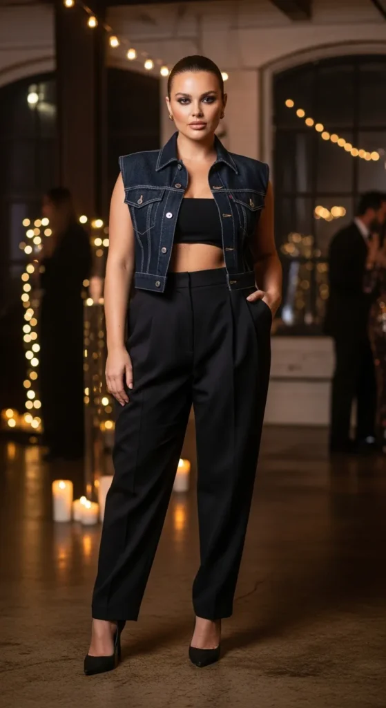 A sleeveless denim vest worn over a bandeau or tank paired with relaxed trousers creates a strong, confident Y2K-inspired look that feels tailored but not restrictive.