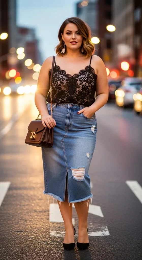 A lace-trim cami styled with a denim midi skirt feels soft yet structured. It’s feminine without being overly delicate.
