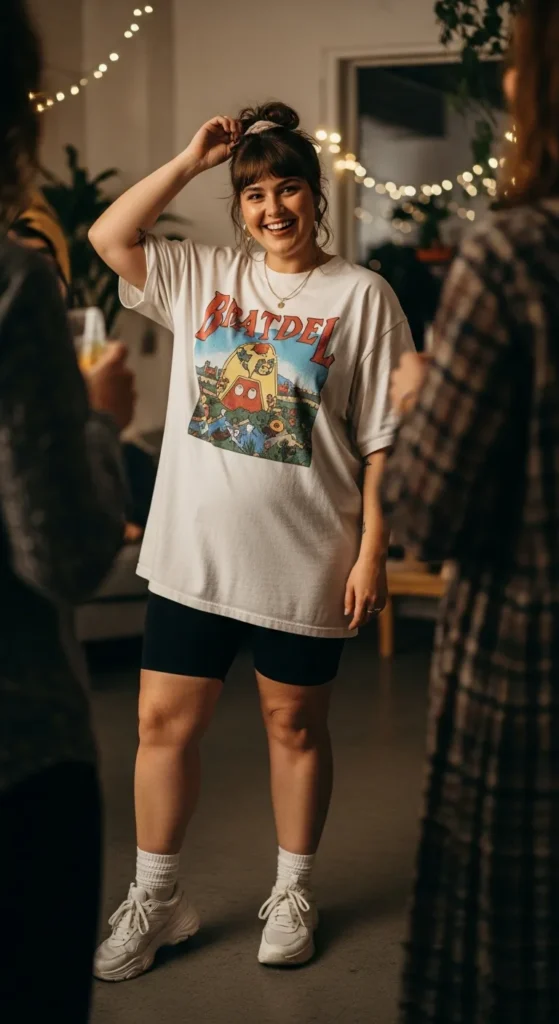 An oversized graphic tee worn with biker shorts is effortless, comfy, and undeniably Y2K. It’s a go-to look that feels relaxed yet styled when done right.