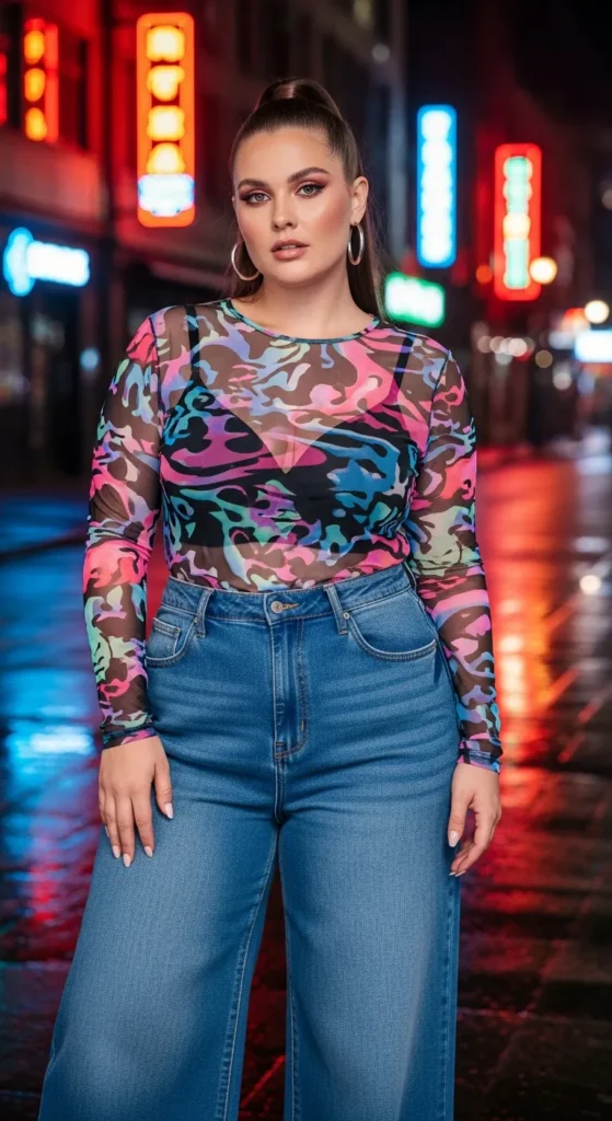A sheer printed mesh top layered over a bralette with wide-leg jeans brings that nostalgic Y2K edge while staying breathable and flattering. It hugs without clinging too tightly.