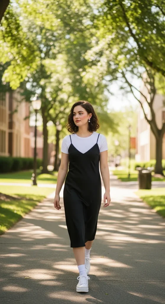 A simple tee layered under a lightweight slip dress creates that iconic Y2K layered look. It’s cute, breathable, and perfect for adding variety to your everyday outfits.