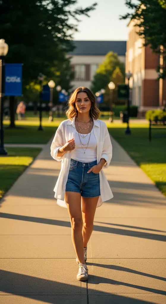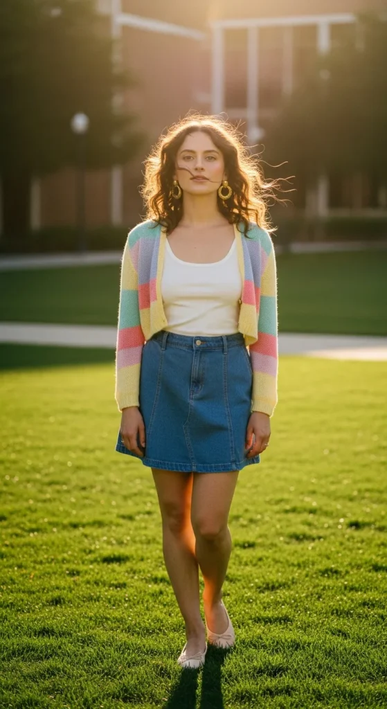 A lightweight cropped cardigan layered over a simple tank with a denim mini skirt feels soft, feminine, and slightly nostalgic. It’s perfect for classrooms with air conditioning while still staying summer-friendly.
