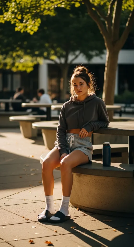 A cropped hoodie paired with lightweight drawstring shorts creates a cozy yet summer-ready outfit. It’s ideal for relaxed school days or casual hangouts after class.