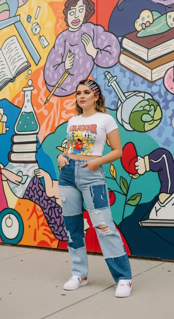 A graphic baby tee with patchwork jeans adds personality and creativity to your look. It’s playful, slightly bold, and perfect for expressing individuality.