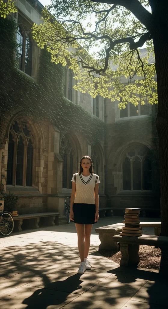 A lightweight knit vest styled with a mini skirt creates a soft academic look with a Y2K twist. It feels cozy without being too warm for summer days.