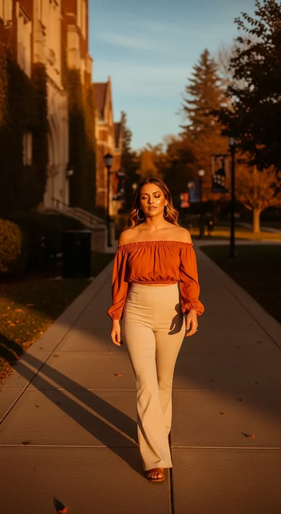 An off-shoulder top paired with flared pants creates a flattering silhouette that feels both relaxed and slightly dressed up for school days.