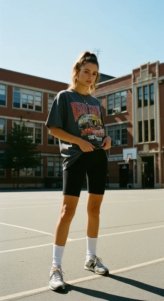 An oversized graphic tee styled with fitted bike shorts gives that casual, sporty Y2K energy. It’s comfortable for busy days and perfect when you still want to look cute with minimal effort.