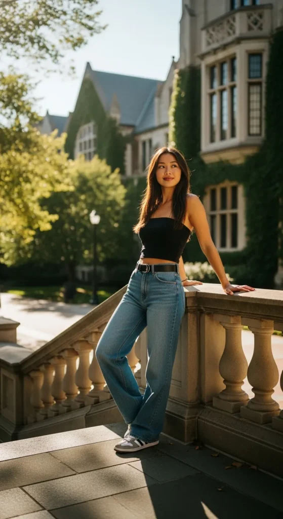 Stylist Suggestion: Choose kitten heels or sleek flats. They elevate the outfit just enough while staying comfortable for walking around campus.