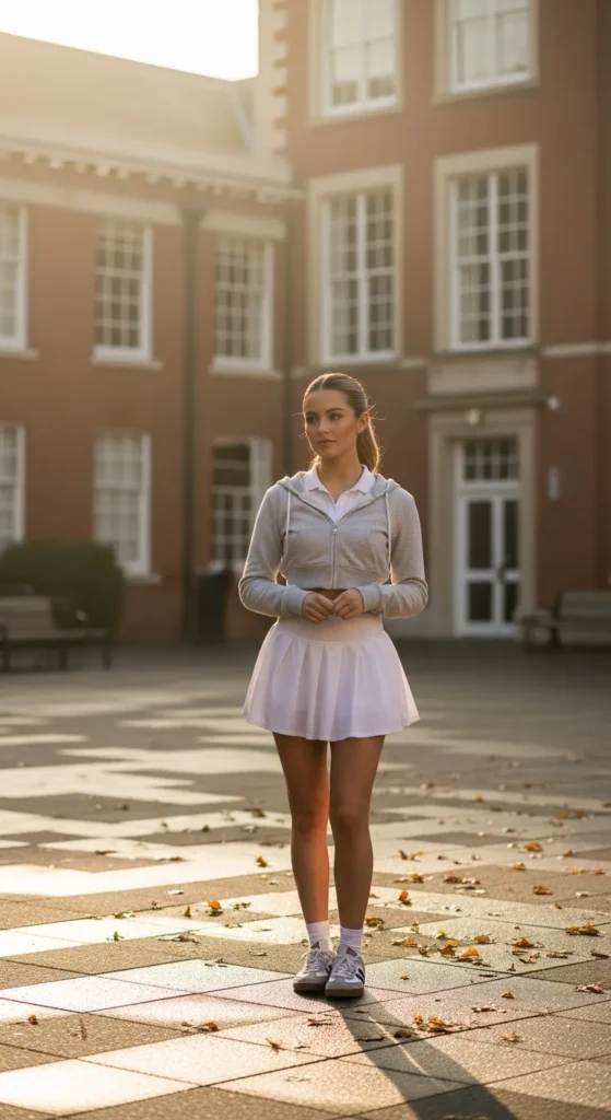 A lightweight zip-up hoodie worn over a tennis skirt blends sporty and cute perfectly. It’s ideal for early classes or breezy mornings when you need an extra layer.