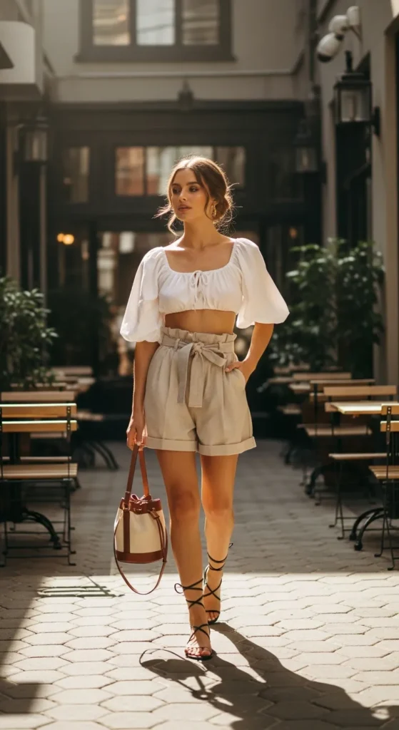 Volume on top and cinched paperbag shorts balance proportions for a relaxed yet chic Y2K vibe. Light fabrics keep you cool while showing off summer-ready legs.