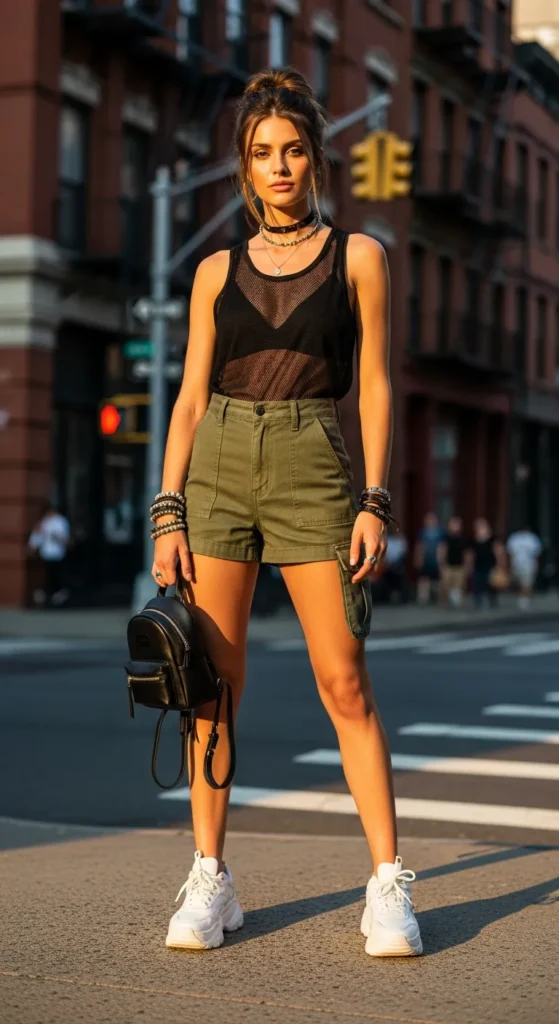 Utility meets style with high-waisted cargo shorts and a mesh tank. Breathable fabrics ensure comfort, while the slightly edgy aesthetic brings modern Y2K vibes for summer street style.