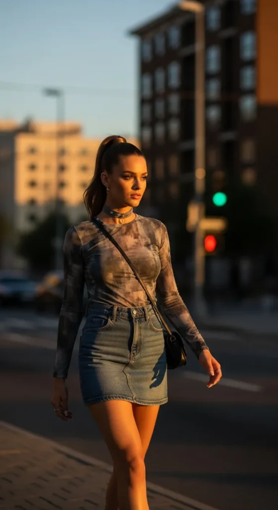 Mix textures for interest: a classic denim skirt pairs with a sheer mesh long-sleeve top. Breathable fabrics make it perfect for hot summer nights with an edgy early-2000s twist.