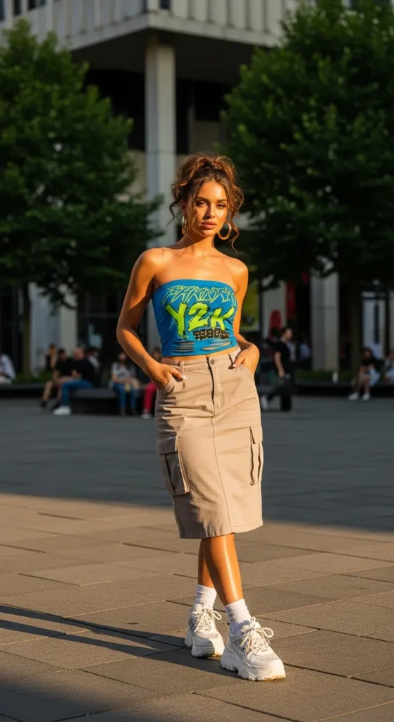 The satin tube top paired with mini cargo pants is a mix of sleek and edgy textures. Breathable, lightweight fabrics keep you comfortable while standing out with Y2K confidence.