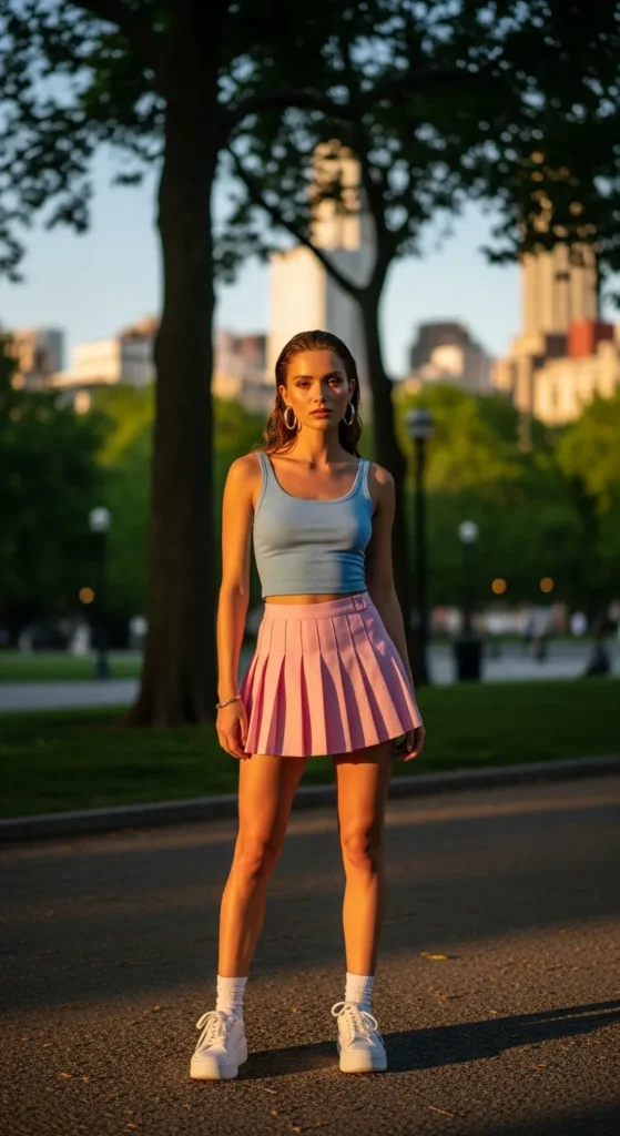Playful and flirty, a pastel pleated skirt paired with a fitted tiny tank top exudes fun summer energy. Lightweight textures keep it breathable while still being camera-ready for street style moments.