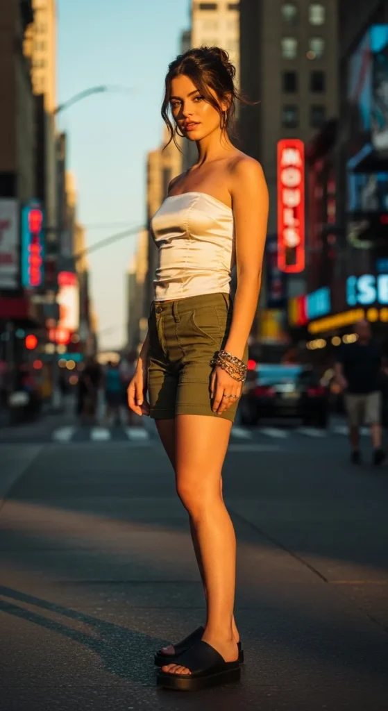 A printed graphic tube top tucked into a neutral cargo skirt balances playfulness and practicality. Lightweight fabrics keep the outfit breathable and perfect for daytime summer fun.