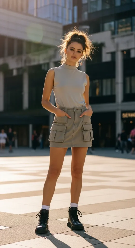 A fitted sleeveless mock neck top with a mini cargo skirt keeps it sleek and edgy. Breathable fabrics and simple lines make this a summer-ready Y2K essential.