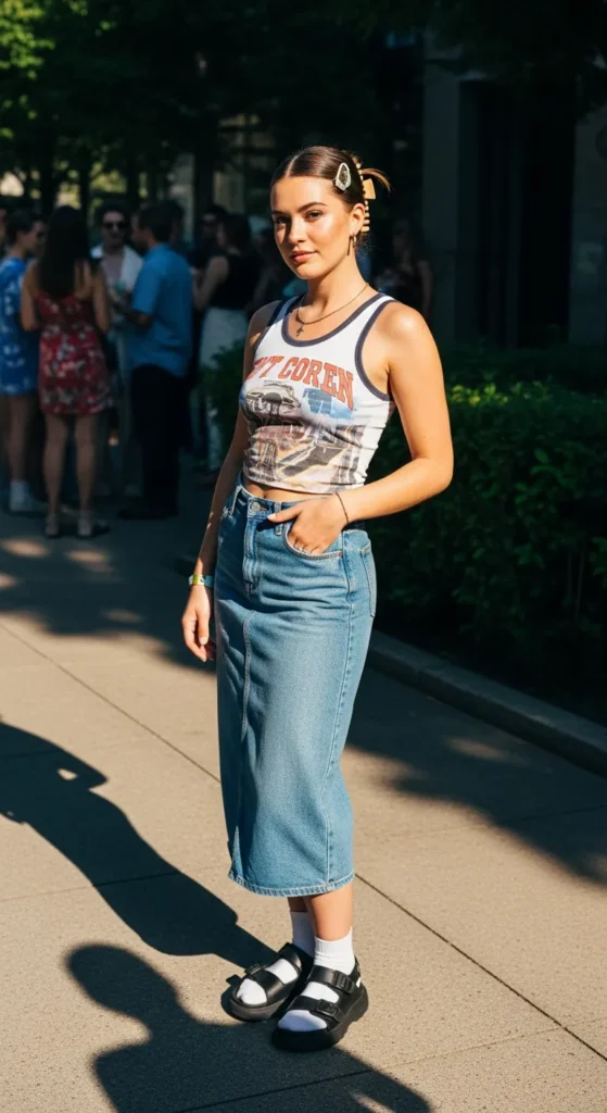 A bold graphic tank paired with a denim midi skirt creates a laid-back yet stylish vibe. It feels like something you just threw on, but it works effortlessly.