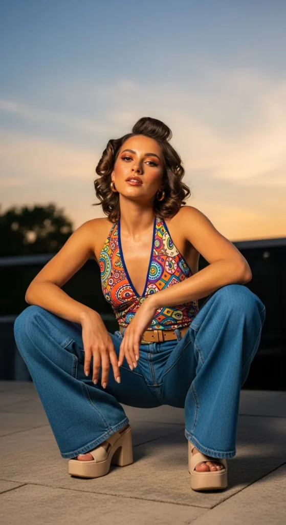 A halter top instantly gives that early 2000s vibe, especially when paired with relaxed wide-leg jeans. It’s flattering, breathable, and perfect for dancing through warm summer nights.