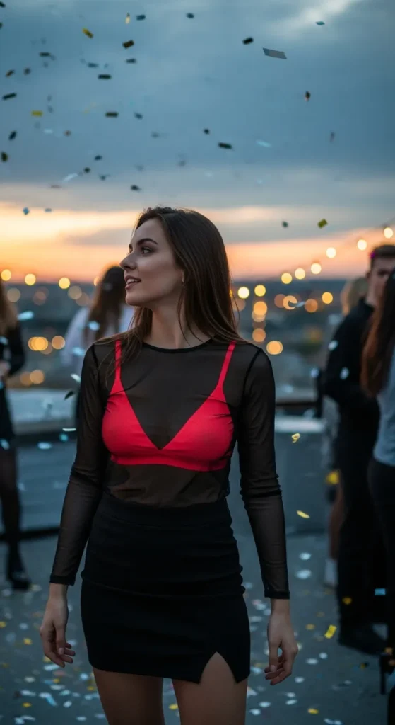 Layering a sheer mesh top over a bold bralette feels playful and daring, while a mini skirt keeps it flirty. It’s the kind of outfit that turns heads without even trying.
