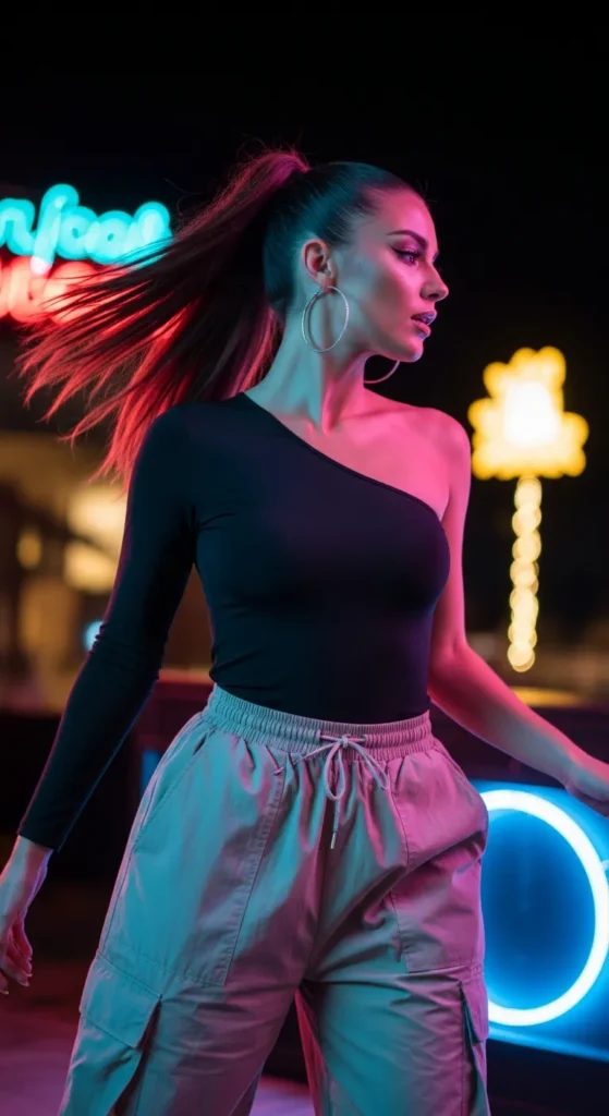 Parachute pants bring volume and movement, while a one-shoulder top keeps the outfit sleek and modern. It’s bold, comfortable, and perfect for dancing all night.