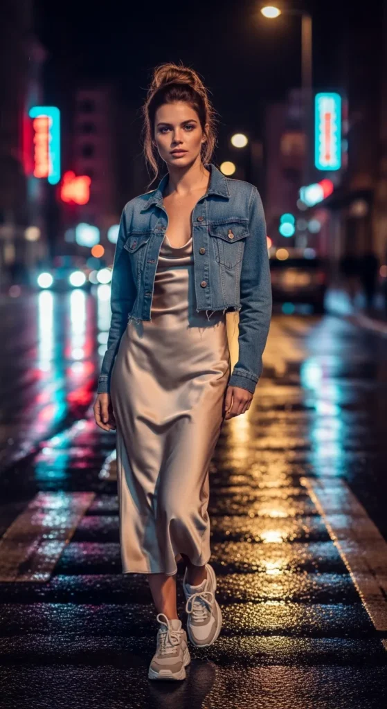 A silky slip dress paired with chunky sneakers creates that perfect mix of soft and edgy. It’s minimal but still feels like you put real thought into your outfit.