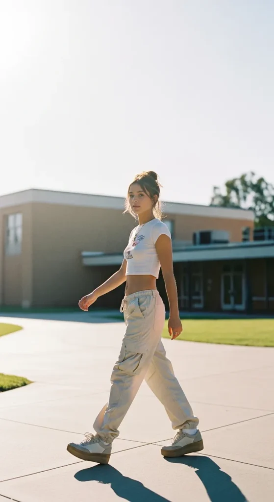 A snug baby tee with loose parachute pants creates a bold contrast that feels relaxed yet fashion-forward for Spirit Week.