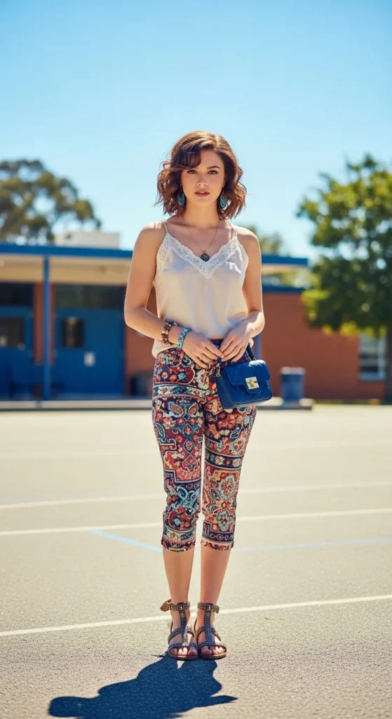 A fitted cami paired with printed capri pants brings back a playful summer vibe that feels light, colorful, and easy to wear.