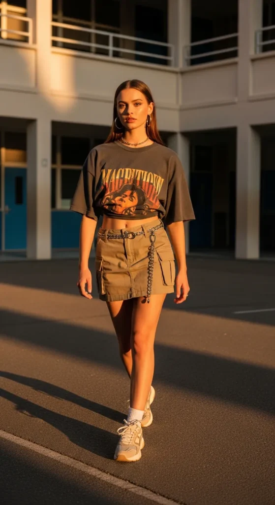 An oversized graphic tee tucked slightly into a khaki cargo mini skirt gives off effortless cool. The mix of relaxed and structured pieces feels laid-back yet intentional for Spirit Week fun.