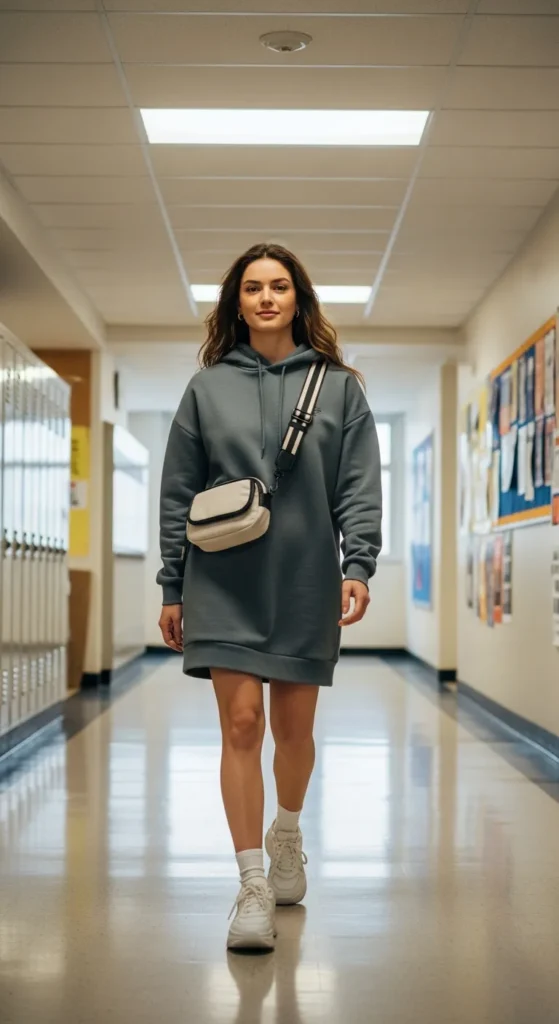 A hoodie dress styled with chunky sneakers is the perfect mix of comfort and style, ideal for long Spirit Week days while still looking put together.