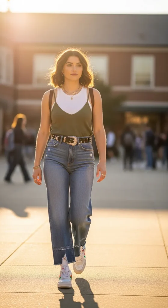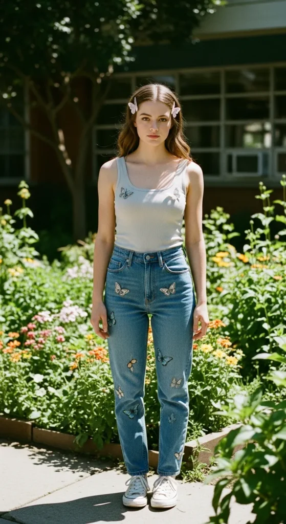 A simple fitted tank paired with butterfly-embroidered jeans feels playful and nostalgic. It’s a subtle nod to Y2K trends without being overly dramatic.