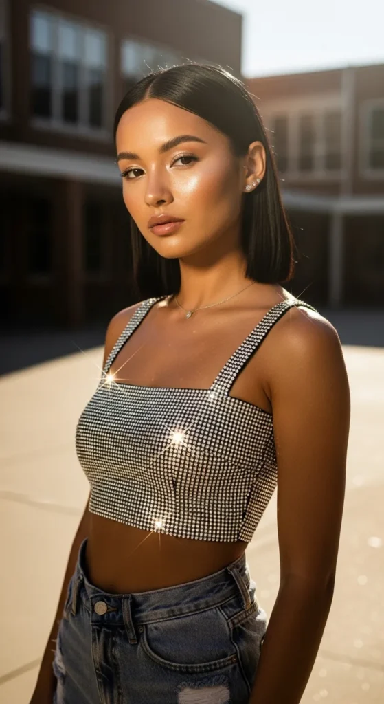 A rhinestone-detailed top paired with classic denim shorts adds sparkle without being over-the-top. It’s fun, youthful, and perfect for summer Spirit Week energy.