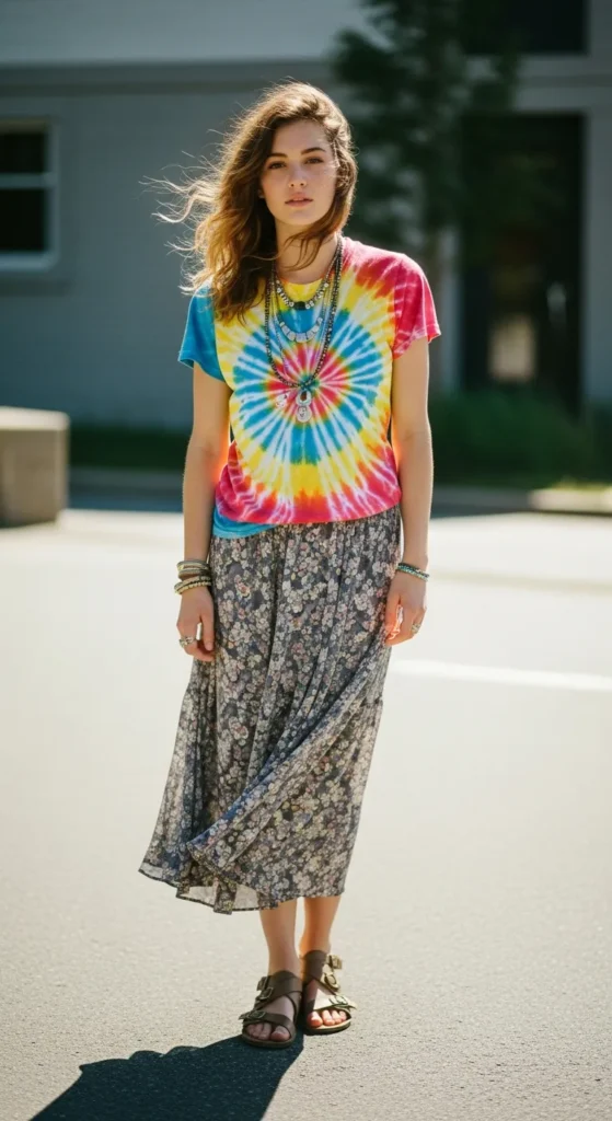 A colorful tie-dye tee tucked into a lightweight flowy skirt creates a breezy, cheerful look that feels carefree and expressive.
