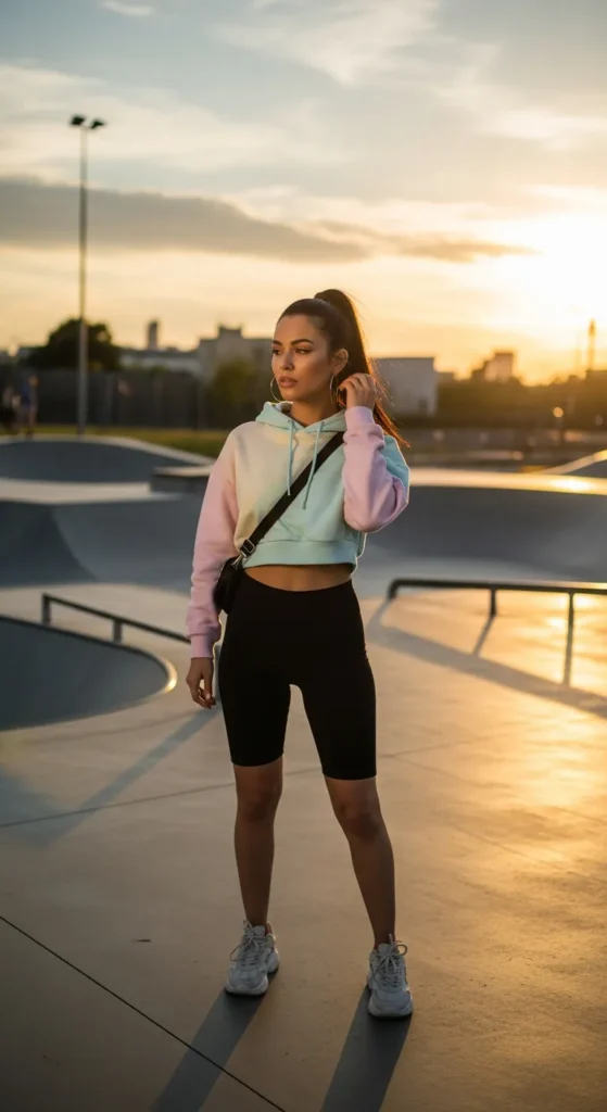 For cooler summer evenings, a cropped hoodie paired with fitted biker shorts creates casual Y2K comfort with streetwear energy.