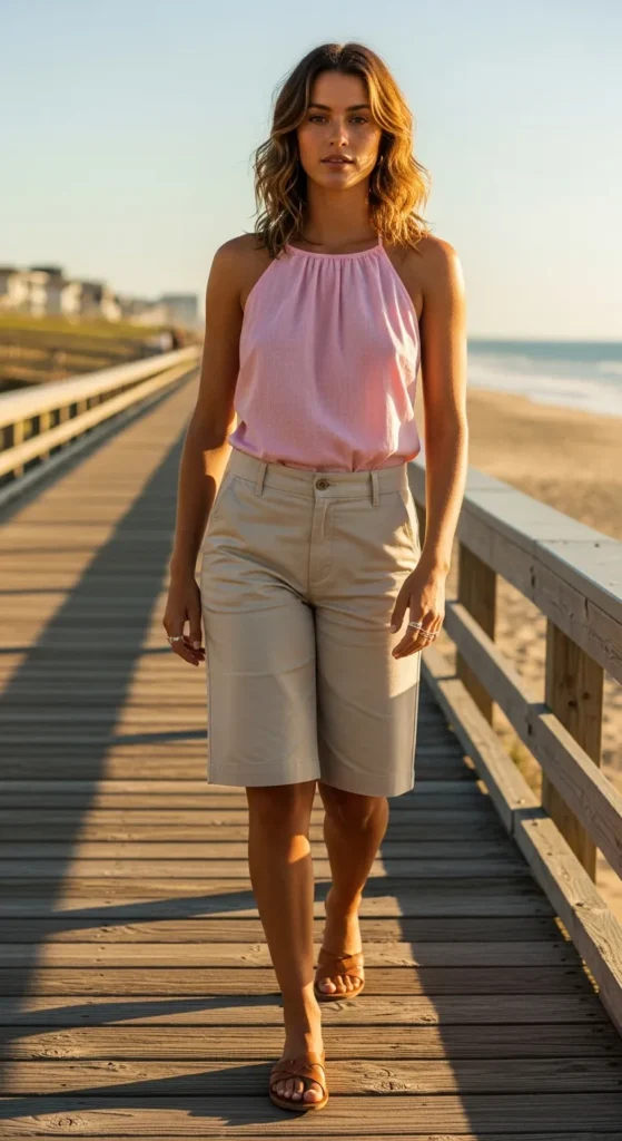 A halter tie-back top with mid-length Bermuda shorts is playful, flirty, and perfect for casual summer afternoons.