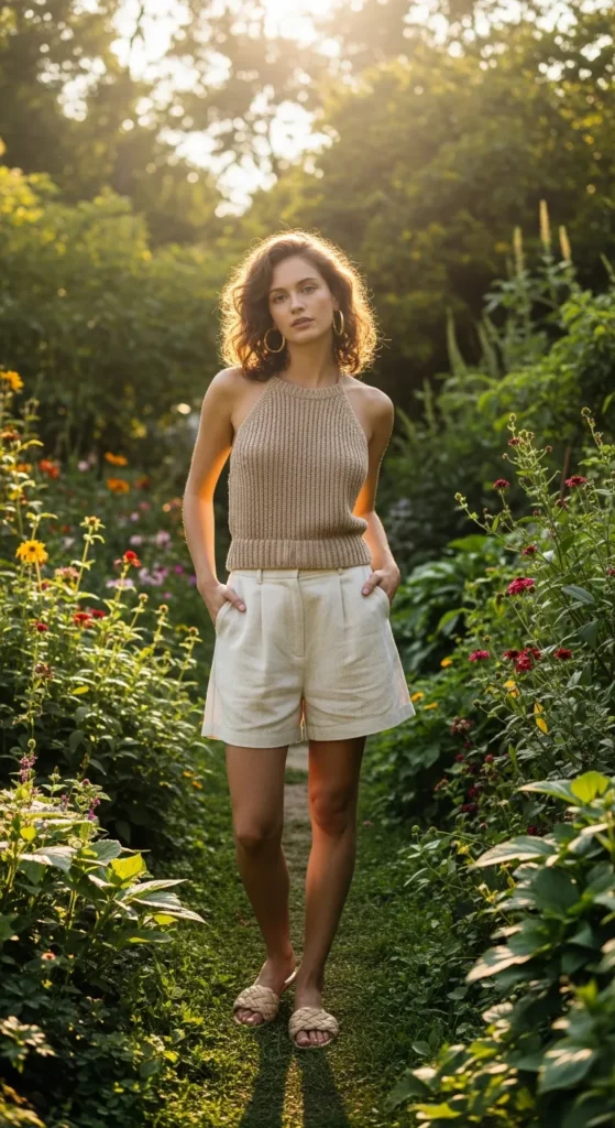 A soft, breathable knit halter top tucked into loose linen shorts creates a cozy yet flirty summer look. Neutral tones evoke natural summer warmth.