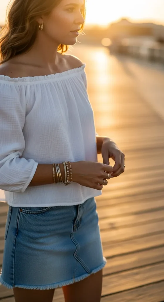 Stylist Suggestion: Delicate layered bracelets and small hoop earrings complement the off-shoulder neckline. Loose waves or a half-up braid enhance feminine summer vibes.