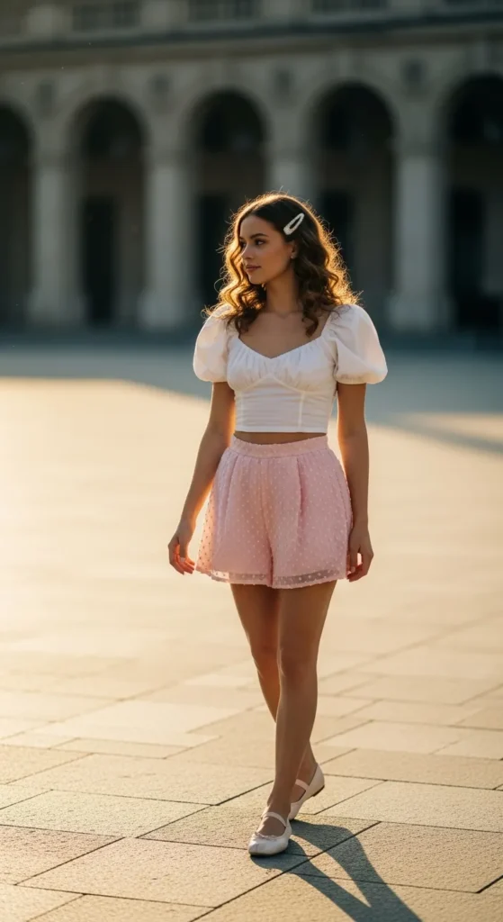 A puff sleeve crop top paired with pleated shorts combines Y2K femininity with a relaxed modern twist. Perfect for casual brunch or shopping days.