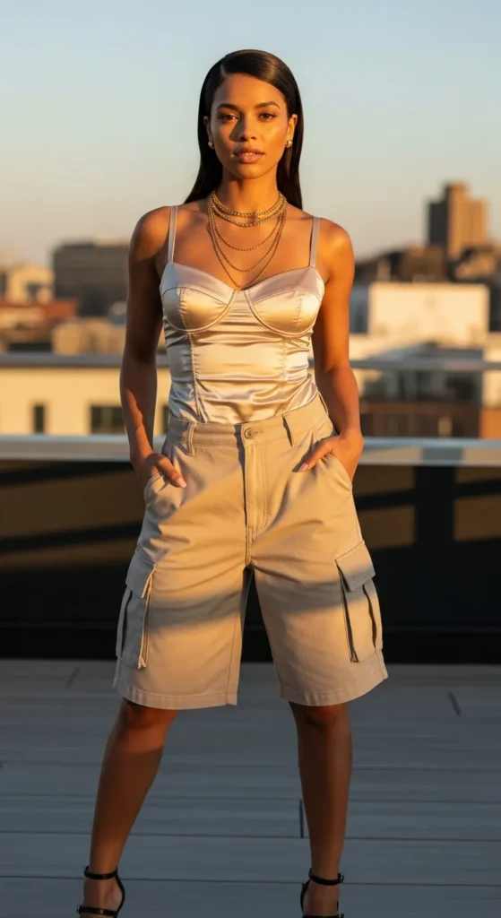 A structured satin bustier paired with loose cargo shorts balances flirty luxury with street-ready casualness. Y2K vibes meet modern chic effortlessly.