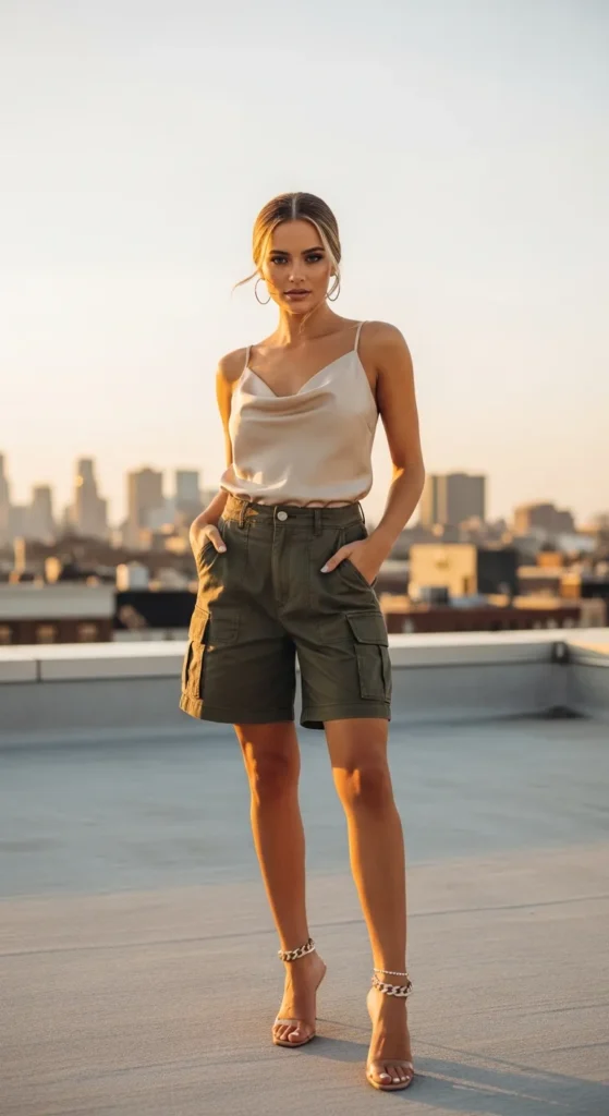 A silky satin cami tucked into relaxed cargo shorts delivers a chic Y2K mix of luxe and street style. The flowy cami contrasts the structured pockets, keeping the outfit balanced.